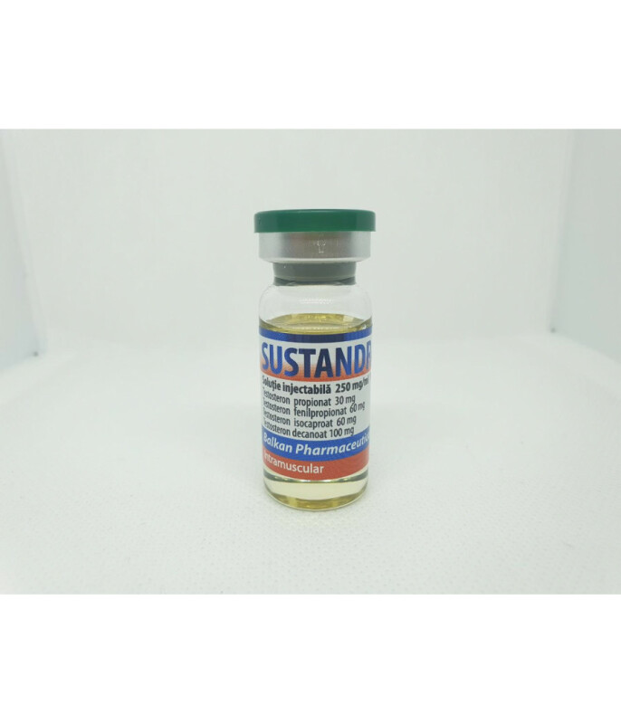 Сустанон Sustandrol 10ml 250mg/1ml Balkan PharmВ нашем онлайн-магазине вы можете выгодно купить Sustandrol. Этот препарат изготовлен известной фармацевтической компанией Балкан Фарма из Молдовы. ОН пользуется большой популярностью среди атлетов разного уровня подготовки. Однако мы рекомендуем заказать Sustandrol только тем спортсменам, которые уже провели несколько курсов с участием легких анаболиков.Дело в том, что Сустандрол является сильным стероидом. Этот факт говорит о том, что риски развития побочек на его курсе достаточно высоки. В состав суста входит 4 активных компонента, которые представляют собой эфиры Тестостерона с разным периодом полужизни. Благодаря этому они последовательно вступают в работу и обеспечивают ровный гормональный фон.При этом начинает воздействовать на организм он практически сразу после введения. Это один из факторов высокой популярности данного анаболика. Вторым является привлекательная цена Sustandrol. На максимально выгодных условиях приобрести спортфарму вы можете у нас.Эффекты Sustandrolактивно стимулирует процессы гипертрофии мышечной массы;увеличивает работоспособность и силу;положительно влияет на работу суставов;является сильным антикатаболиком;ускорят работу кроветворной системы.Соло курс SustandrolНедельная дозировка препарат находится в диапазоне 250-750 мг. Чаще всего длительность курсов с участием суста ограничивается 2-3 месяцами. Так как это препарат пролонгированного действия, то для обеспечения ровного гормонального фона достаточно делать максимум 2 укола в течение семи суток. Также помните, что Сустанон активно ароматизируется. Чтобы избежать побочек эстрогенного типа, обязательно используйте ингибиторы ароматазы. Также при употреблении анаболика на протяжении от 12 недель, введите в состав курса Гонадотропин.Комбинирование препаратаЧаще всего атлеты используют суст совместно с Декой, Параболаном, Тренболон Энантатом, Анаполоном, Метандиеноном. Все эти связки предназначены для набора максимально возможного количества массы. ПКТ после курса SustandrolЧерез 12-15 дней с момента отмены анаболика, обязательно проведите ПКТ. На протяжении 3-4 недель вам предстоит принимать Кломид либо Тамоксифен по 50 и 20 мг соответственно. Приобрести препараты для атлетов в нашем магазине могут атлеты из любого города Украины: Запорожья, Киева, Белой Церкви, Ивано-Франковска и т.д.