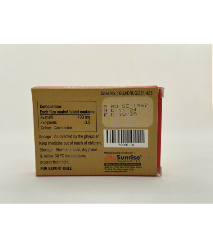 Купить AVANA 100: идеальное решение для быстрого восстановления мужской силыAVANA 100 – современный препарата, который по своей эффективности сопоставим с такими известными средствами, как Виагра, Сиалис и Левитра, но при этом обладает рядом существенных преимуществ. Ключевым достоинством AVANA-100 является его максимально быстрое действие, что делает его предпочтительным выбором для мужчин, стремящихся к оперативному результату. Многочисленные клинические исследования и практический опыт применения подтверждают минимальную вероятность развития побочных эффектов. Данный дженерик препарата Стендра производится индийской фармацевтической компанией Sunrise Remedies.Фармакологические аспекты действия AVANA 100Основным действующим веществом препарата является аванафил, содержащийся в каждой таблетке в дозировке 100 мг. Данная концентрация активного компонента обеспечивает достижение устойчивой эрекции, необходимой для полноценного полового акта.Действие AVANA 100 проявляется уже через 15 минут после приема, а продолжительность эффекта варьируется от 4 до 6 часов. В течение этого времени мужчина способен к естественному совершению полового акта. Благодаря фармакологическому воздействию аванафила, усиление потенции происходит физиологичным путем: половые органы получают интенсивный приток крови, что приводит к надежной эрекции при условии наличия сексуального возбуждения. При этом риск возникновения нежелательных побочных реакций сведен к минимуму.Показания к применению дженерика AVANA-100Препарат предназначен для мужчин, страдающих от недостаточной или сниженной эрекции, а также импотенции различного генеза. Важным преимуществом AVANA 100 по сравнению с аналогами является возможность его применения у пациентов с сопутствующими сложными патологиями здоровья и хроническими заболеваниями, такими как сахарный диабет.Компонентный состав препаратаАктивным действующим веществом AVANA 100 является аванафил, содержание которого в одной таблетке составляет 100 мг.Рекомендации по применению:Стандартная рекомендуемая доза AVANA 100 составляет 100 мг аванафила. Таблетку следует принимать в среднем за 25 минут до предполагаемого полового контакта. Препарат гарантированно способствует повышению потенции, однако для достижения стойкого результата необходимо наличие сексуального партнера противоположного пола и предварительная сексуальная стимуляция (ласки).ПротивопоказанияAVANA-100 может применяться мужчинами с сахарным диабетом, однако при наличии других хронических заболеваний перед началом приема препарата рекомендуется проконсультироваться с лечащим врачом.Основные противопоказания к применению AVANA 100:Заболевания сердечно-сосудистой системы в тяжелой форме.Возраст до 18 лет.Выраженная печеночная и почечная недостаточность.Возможные побочные эффектыПобочные эффекты при применении AVANA 100 (аванафила) возникают крайне редко. У незначительного процента мужчин могут наблюдаться такие реакции, как головная боль, диспепсические расстройства и головокружение.Превышение рекомендованной дозы дженерика Stendra AVANA 100 (аванафила 100 мг) не рекомендуется, так как нарушение инструкции по применению может увеличить вероятность проявления побочных эффектов. Также не следует принимать препарат одновременно с алкогольными напитками, особенно при наличии хр